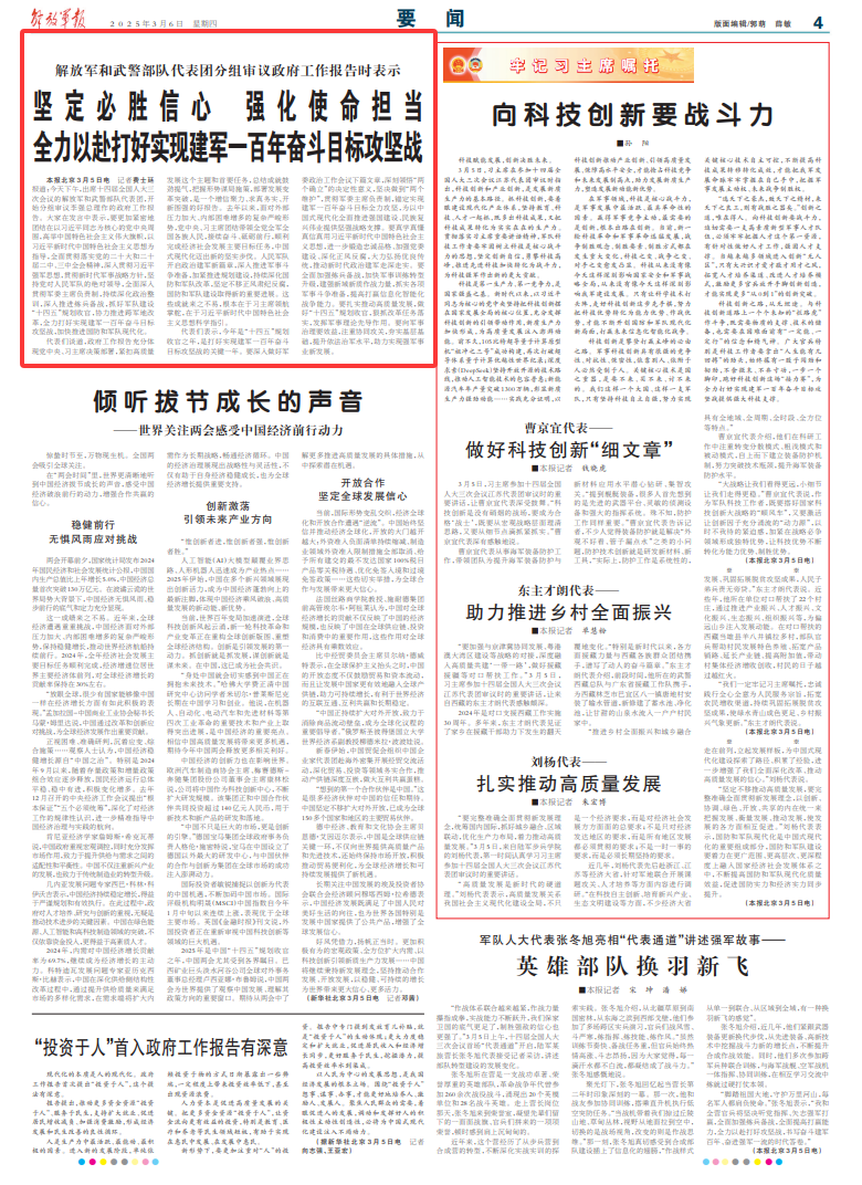 解放军和武警部队代表团分组审议政府工作报告时表示