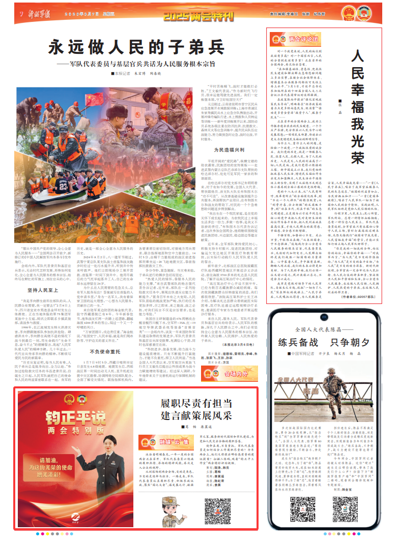 从训练场到两会会场,变的是角色,不变的是使命与担当。一路走来,军队代表委员认真履职尽责、积极参政议政,聚焦“国之大者”,谋发展之计、献强军之策,服务新时代国防和军队建设,为党和人民交出合格的履职答卷。