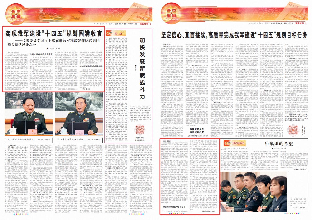 我军建设“十四五”规划实施4年多来,取得一系列重大成果,同时也面临不少矛盾和问题,仍有不少“硬骨头”要啃。一位代表表示,从新型武器试验平台技术的突破,到高原部队新型营房建设的攻坚,都是攸关战斗力生成的“必答题”。“实现‘十四五’规划圆满收官,打好实现建军一百年奋斗目标攻坚战就取得了重要进展。”