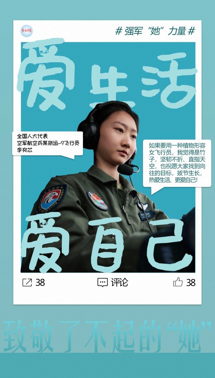 “如果要用一种植物形容女飞行员,我觉得是竹子,坚韧不折、直指天空,也祝愿大家找到向往的目标,拔节生长,热爱生活、更爱自己!”