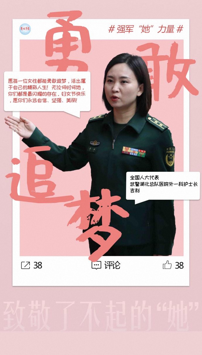 “在这个属于女性的日子里,同时祝愿绿色军营中的铿锵玫瑰、强军征程上的巾帼力量节日快乐,让我们用实际行动展现女性风采。”
