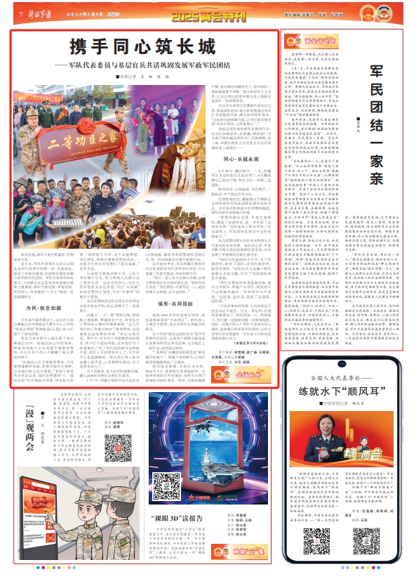 连日来,军队代表委员与来自全国各地的代表委员同聚一堂,共商国是。政府工作报告强调,巩固和发展坚如磐石的军政军民团结。军队代表委员纷纷表示,人民群众永远是我军的坚强后盾和力量源泉,新时代新征程,军地协同、军民同心,我军建设“十四五”规划一定会圆满收官。