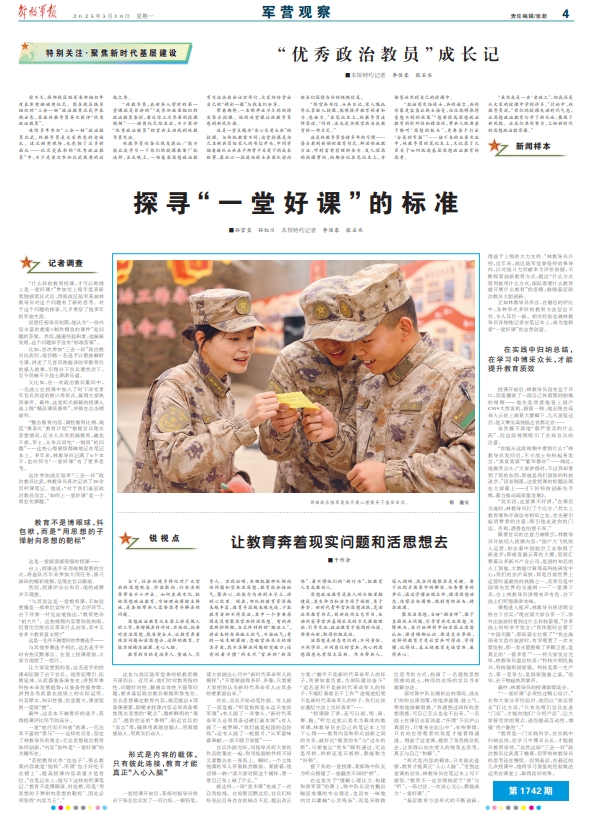聚焦活思想,当好“调音师”,敢于直面热点问题,引导官兵交流思想、交锋观点,在讨论辨析中切实匡正思想认知、澄清模糊认识、廓清是非界限,这样的教育才更让官兵听得进、学得懂、记得住,真正使教育走进官兵、赢得兵心。