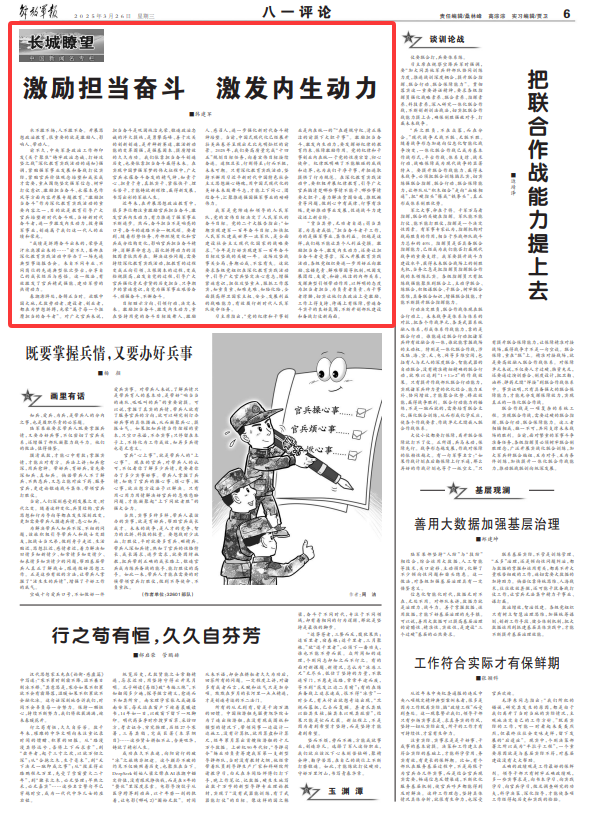 春潮澎湃处,奋楫正当时。放眼中国大地,无数劳动者、建设者、创业者,都在为梦想拼搏,光荣“属于每一个挺膺担当的奋斗者”。对广大官兵来说,担当奋斗是巩固纯洁光荣、锻造政治忠诚的淬火提纯,是勇攀高峰、善于攻关的创新创造,是开辟新赛道、激活新动能的变革图强,是强基固本、提质增效的久久为功。我们依靠担当奋斗创造历史,也要依靠担当奋斗赢得未来。在实现中国梦强军梦的伟大征程中,广大官兵永葆奋斗奋发的精气神,知责于心、担责于身,真抓实干、紧张快干、埋头苦干,才能铸就新辉煌,赢得新发展,书写出彩的军旅人生。