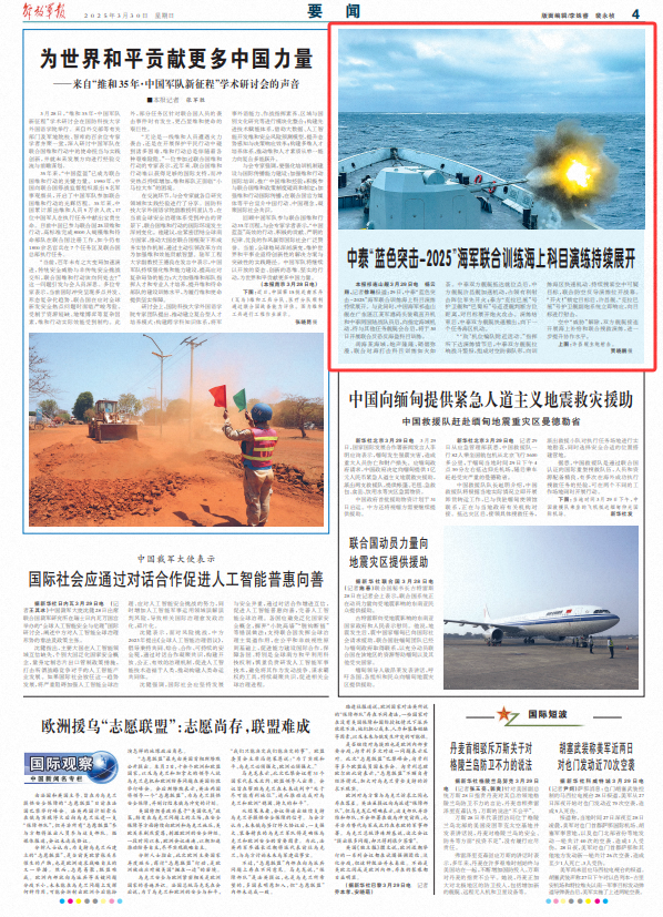 解放军报祁连山舰3月29日电 杨云翔、记者徐琳报道:29日,中泰“蓝色突击-2025”海军联合训练海上科目演练持续展开。与此同时,中国海军祁连山舰在广东湛江某军港码头装载直升机和中泰两国陆战队员后,向指定海域机动,待与其他任务舰艇会合后,将于30日开展联合反恐反海盗科目训练。