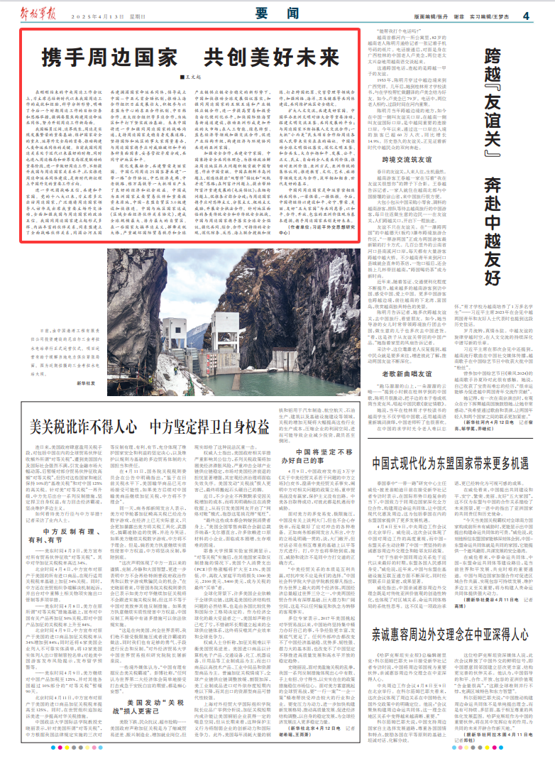 中国同周边国家是命运紧密相连的共同体,一荣俱荣,一损俱损。今后,中国将继续以建设和平、安宁、繁荣、美丽、友好“五大家园”为共同愿景,以和平、合作、开放、包容的亚洲价值观为基本遵循,携手周边国家共创美好未来。