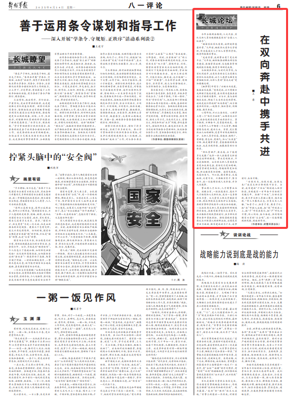 “为战而生,向战而建,征战未来!”这是文职方阵的战斗宣言。当前,我军建设“十四五”规划进入收官阶段,实现建军一百年奋斗目标到了关键之年。决胜“十四五”,打好攻坚战,离不开文职人员凝心聚力、勠力奋战。“男儿不展风云志,空负天生八尺躯。”知责于心、担责于身、履责于行,把“忠”字融入血脉,把“战”字刻在心上,把“干”字写在岗位,把“严”字化为习惯,同心同向、奋斗奋进,共同唱响强军兴军的“大合唱”,就一定能够展现新风貌、创造新作为。