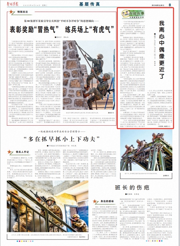 前不久,我在武警广东总队“三会一好”政治教员比武中取得佳绩,成为唯一一名获奖的士兵。走到今天这一步,我用了9年时间。而引领我走上这条路的,是我的军旅偶像——一名政治教员。