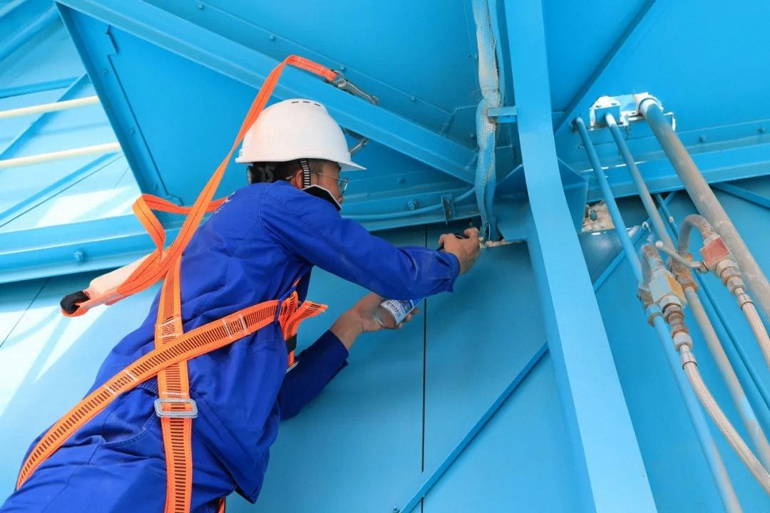 技术人员正在对塔架孔洞进行封堵
