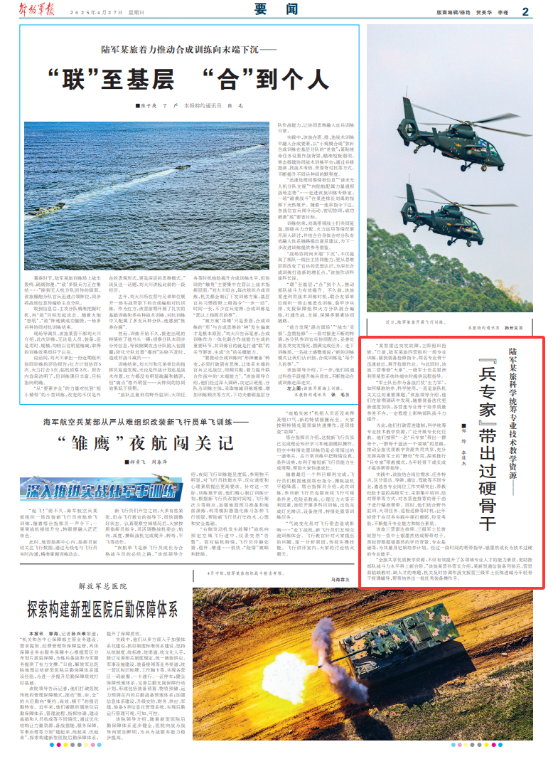 “全旅共享优质教学资源,不仅有效提升了各领域专业人才的能力素质,更助推部队战斗力水平再上新台阶。”该旅某营孙营长介绍,某新型通信装备列装后,营里面临缺教材、缺人才的难题,机关及时协调作战支援营三级军士长陈进城为年轻骨干授课辅导,帮带培养出一批优秀装备操作手。