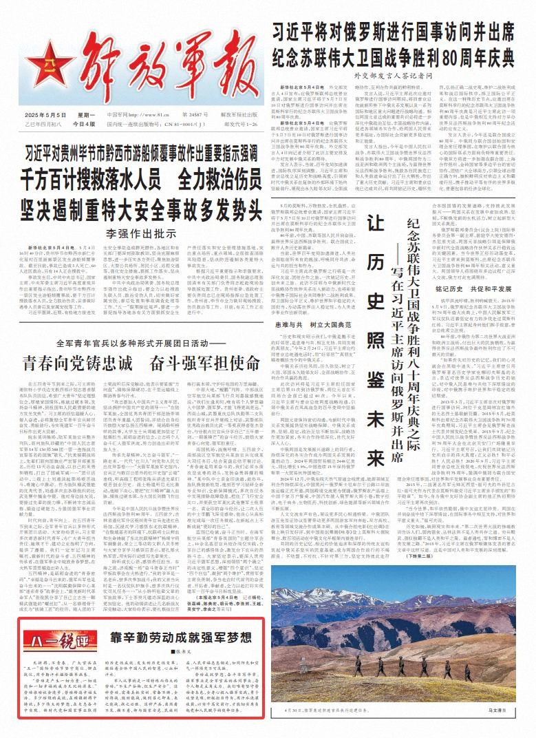 劳动成就梦想,奋斗书写华章。强军事业是全军官兵的共同事业,每个人都是主角主力。我们唯有坚守劳动者本色,全身心投入强军实践,勇于攻坚克难、积极担当作为,用汗水浇灌收获,以实干笃定前行,才能切实肩负起党和人民赋予的使命任务。