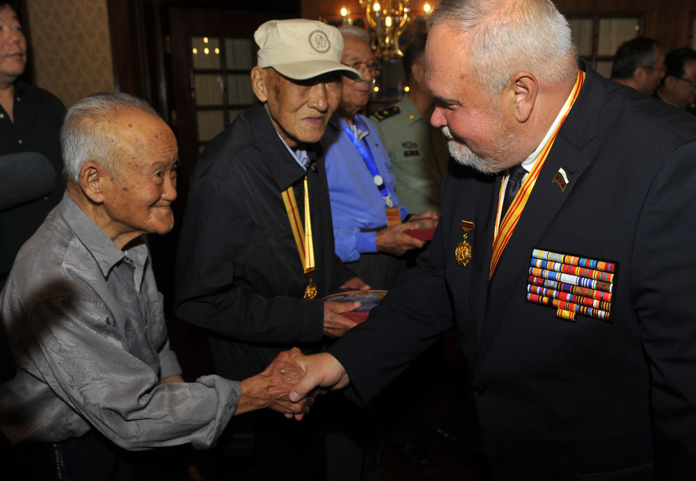 2015年9月5日,二战苏军著名统帅瓦西里·崔可夫的外孙尼古拉·崔可夫(前右)与中国抗战老兵代表在活动现场交流。新华社记者 鲁鹏 摄