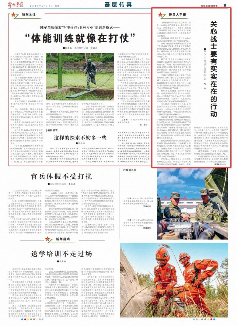带兵育人不能浮在面上,而应该扎根脚底的泥土里。带着这样的思考,我开始留心关注连里的每一名战士。看见成绩波动,上前问问近况;发现有人叹气,主动谈心交心……我还专门制订了一份表格,详细记录每人每周的表现情况。在我的努力下,越来越多的战士愿意表达内心,遇到问题能够及时与干部骨干沟通。下士于宽海主动找我谈心,倾诉失恋的苦闷;列兵张俊鑫主动报告自己大学期间曾参与宣传工作,想为连队建设出一分力……