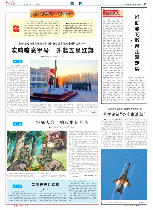 谈起新条令施行给哨所带来的变化,于成成感触颇深:“如今,升国旗不仅是一种仪式,更是一场教育。新条令施行助推部队战斗力生成提高,学条令、守规矩、正秩序已成为官兵的行动自觉。在雄浑的军号声激励下,官兵以更加昂扬的姿态投身练兵备战、建功边防一线。”