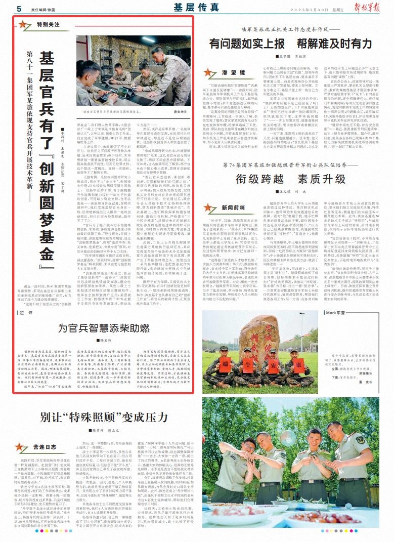 “创新圆梦基金”的设立,激活了基层创新的“一池春水”,该旅官兵思战研战热情越发高涨,群众性创新氛围愈加浓厚。某连二级上士张彪成功研制自动感应爆破组件,成果在全旅得到推广运用;某营成立工作室,鼓励技术骨干和专业能手发挥自身优势革新器材,带动战斗力提升……
