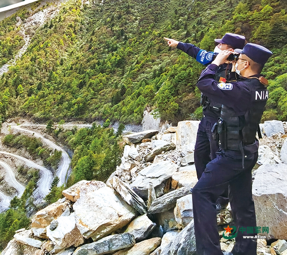 王微(后)和同事在巡逻途中观察前方情况。受访者供图