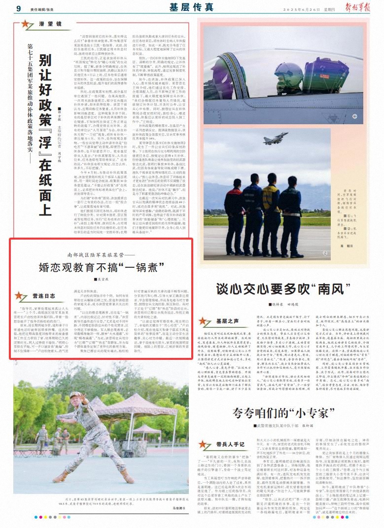 “以往的婚恋观教育,往往是‘一锅煮’,内容比较泛泛,针对性不强。”该营教导员盛伟进行反思,“尤其是对不同年龄、不同婚恋阶段官兵的个性化需求,区分得还不够精细。军人婚恋观教育,必须像精准施训一样,摒弃‘大水漫灌’,实现‘精准滴灌’。”为此,该营将官兵划分为“已婚”“订婚”“热恋”等群体,并为每个群体量身定制了差异化的教育方案。