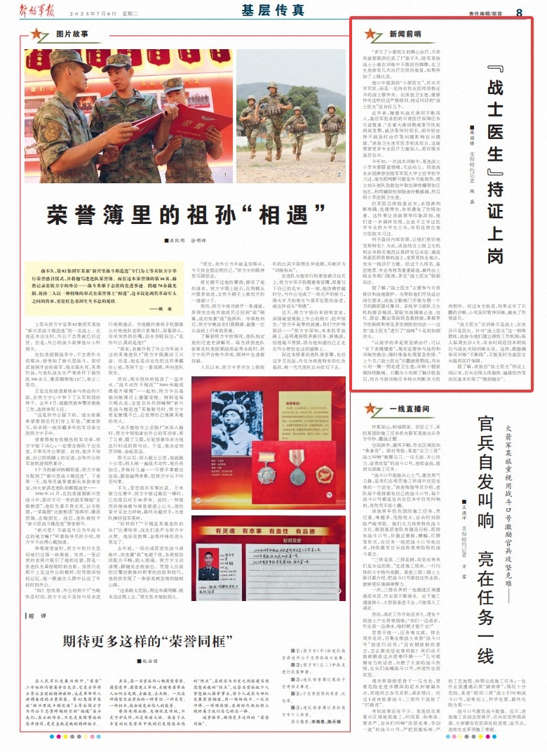 近年来,随着实战化演训不断深入,基层军医承担的日常医疗保障任务日益繁重。“在重大演训期或季节性疾病高发期,就诊等待时间长、部分轻症得不到及时治疗等问题影响官兵健康。”该旅卫生连军医李柏及坦言,这就需要更多专业医疗力量加入,更好服务基层官兵。