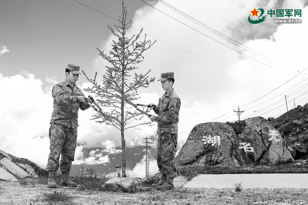 哨所战士为树苗修枝剪叶。