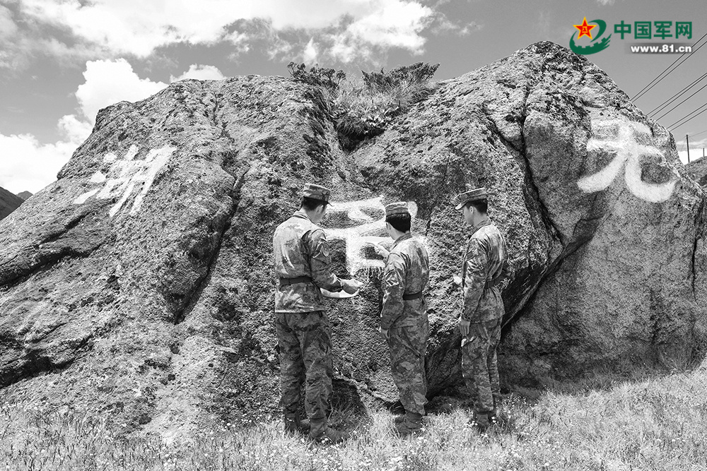 哨所战士为戍边石描红。张照杰摄