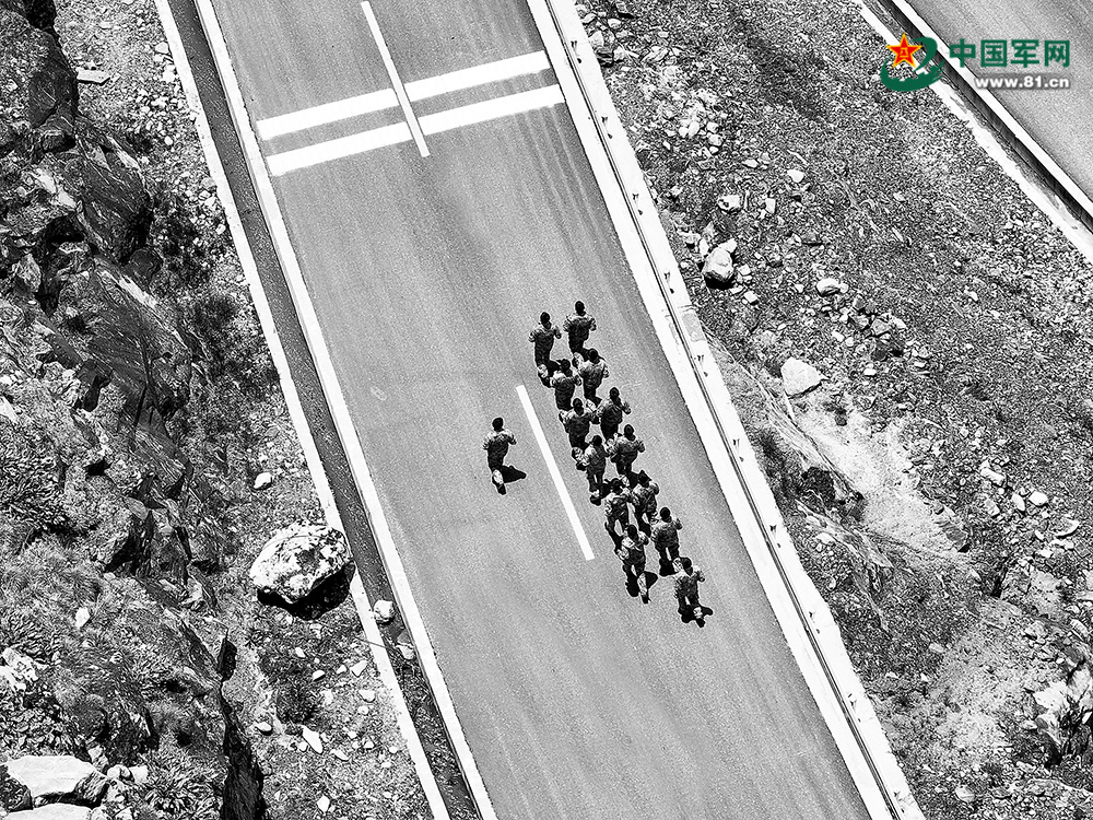 哨所官兵在山间的柏油路上跑步。张照杰摄