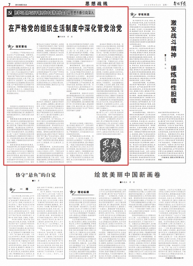 习主席指出:“严肃党内政治生活是全面从严治党的基础。党要管党,首先要从党内政治生活管起;从严治党,首先要从党内政治生活严起。”党的组织生活是党内政治生活的重要内容和载体,是党组织对党员进行教育、管理和监督的重要形式。严格党的组织生活制度是健全党的组织生活、提高党的组织生活质量的根本保障。党的十八届六中全会通过的《关于新形势下党内政治生活的若干准则》提出:“党组织要严格执行组织生活制度,确保党的组织生活经常、认真、严肃。”奋斗建军百年、奋进强军一流,必须把提高党的组织生活质量摆在更加突出的位置,在严格党的组织生活制度中深化管党治党,不断增强党组织的创造力、凝聚力和战斗力,为锻造听党指挥、能打胜仗、作风优良的人民军队提供坚强政治保证。