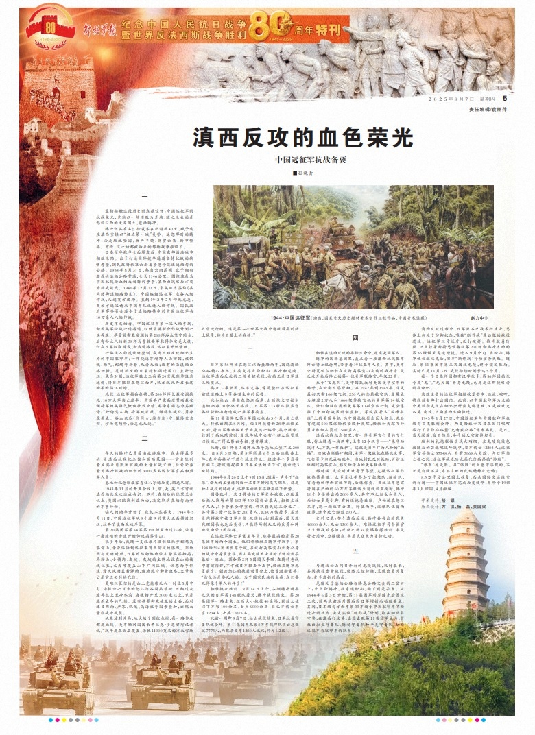 乘胜追击的远征军相继收复芒市、遮放、畹町,将残敌全部打出国门。此前,以中国驻印军为主的中美混合支队在缅北全歼密支那守敌,又先后攻克八莫、南坎,正向滇西方向挺进。