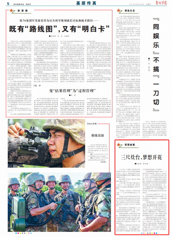 在随后组织的新兵炊事比武中,王枭宇勇夺“厨艺最佳进步奖”。领奖台上,他发表了一段“滋味十足”的获奖感言:“现在我知道了面团醒发多久做出来的馒头最松软,土豆丝炒多久出锅最合适……我们对练兵备战的贡献,就在于让战友们吃好、吃出健康、吃出战斗力!”