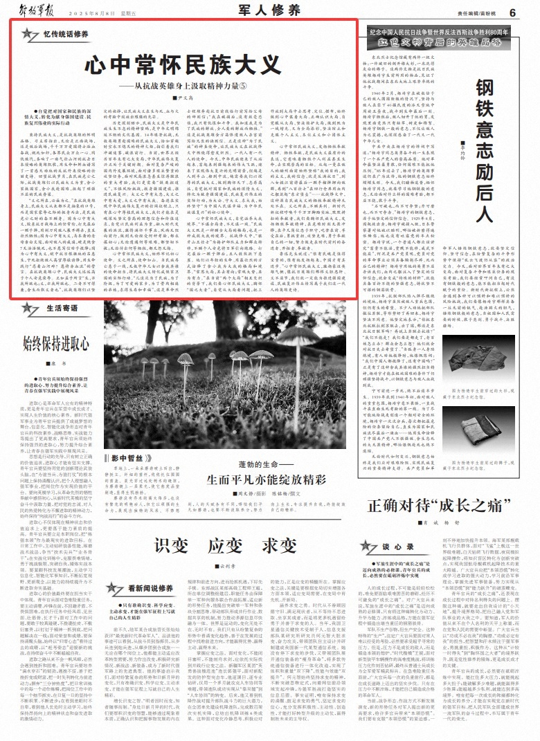 鲁迅先生说过:“惟有民魂是值得宝贵的,惟有他发扬起来,中国才有真进步。”心中常怀民族大义,激扬豪迈英雄气概,像抗日英雄们那样义胆忠肝、义不屈节,我们就一定能为推进强国建设、民族复兴伟业续写属于我们这一代人的英雄史诗。