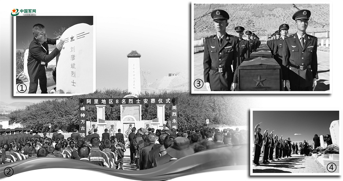 图①:刘涛擦拭刘彦斌烈士墓碑。图②:8名烈士安葬仪式现场。图③:礼兵护送烈士遗骸棺椁等待安葬。图④:小学生在烈士墓前敬少先队队礼。普索朗、巴拉提、戴学武 摄