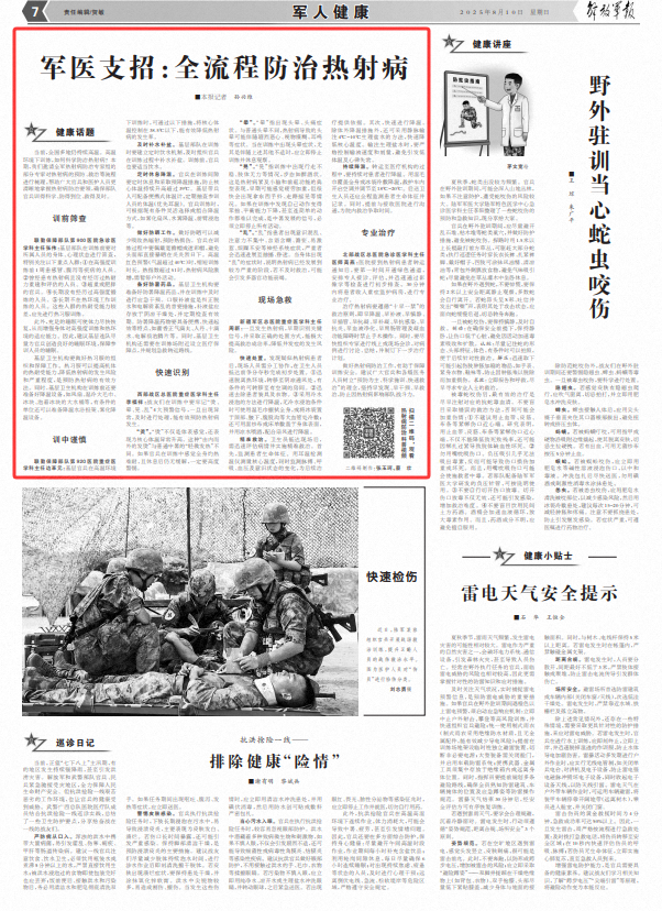 做好热射病防治工作,有助于保障训练安全。建议广大官兵和各级医务人员树立“预防为主、科学施训、快速救治”的理念,坚持早发现、早干预、早救治,防止因热射病影响部队战斗力。
