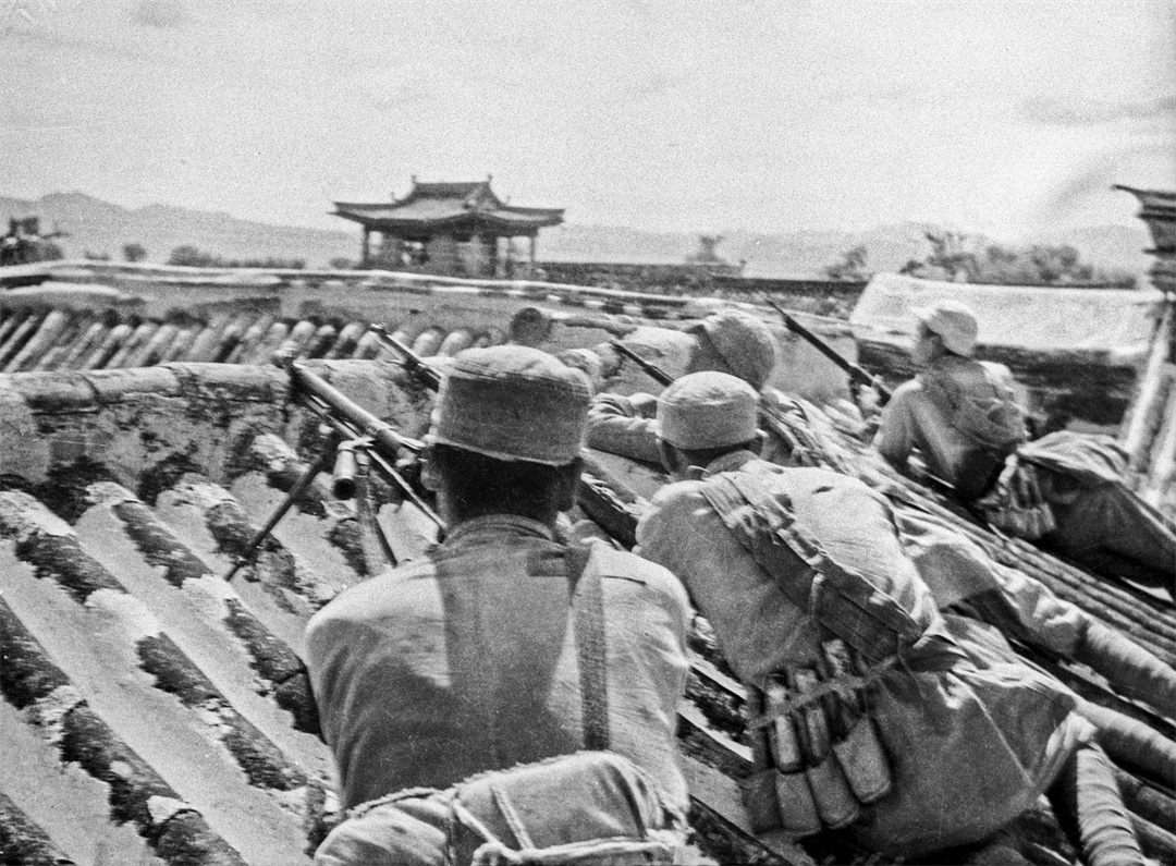 1945年8月26日,我军解放涿鹿城。图为官兵在城内与敌作战场景。