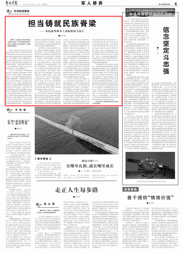 “为有牺牲多壮志,敢教日月换新天。”回望那段波澜壮阔的历史,解读抗战英雄的担当精神,本质上是在解码中华民族的精神基因。担当,承载着先辈们的热血与牺牲,见证了中华民族的坚韧与不屈,其精神力量穿越时空,激励我们砥砺前行。新时代新征程,我们肩负着实现中华民族伟大复兴的历史使命,面对风险挑战和困难考验,我们要传承和弘扬抗战英雄身上的担当精神,将个人命运与国家、民族的前途命运融为一体,在党和人民需要的时候挺身而出,以“功成不必在我”的精神境界和“功成必定有我”的历史担当,完成好我们这一代人的历史使命,书写出属于我们这一代人的辉煌篇章。这既是无愧于先辈们浴血奋战的传承之举,也是实现中华民族伟大复兴的必由之路。