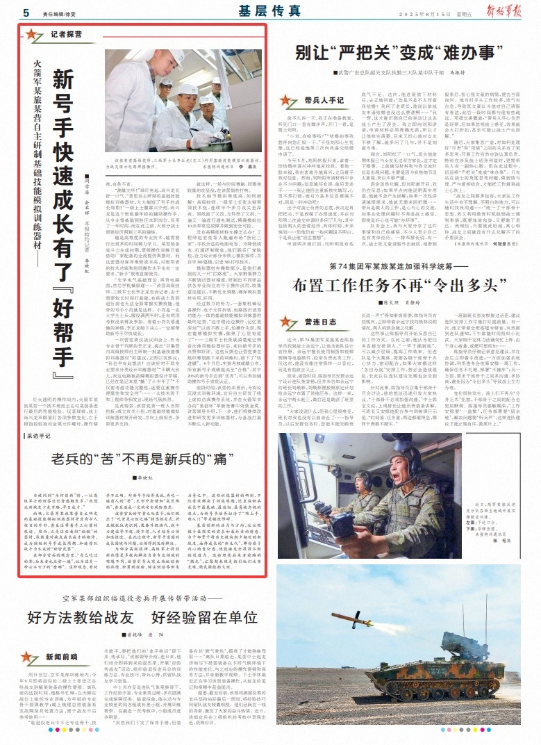 基层创新的活力与方向,往往根植于最现实的需求和最朴素的情感。当干部骨干将目光投向朝夕相处的新战友、亟待成长的“新生代”,那份源于内心的责任感,便能激发出源源不断的创造力。这些照亮后来者前路的“微光”,汇聚起来便是指引他们攻坚克难、精武强能的火炬。