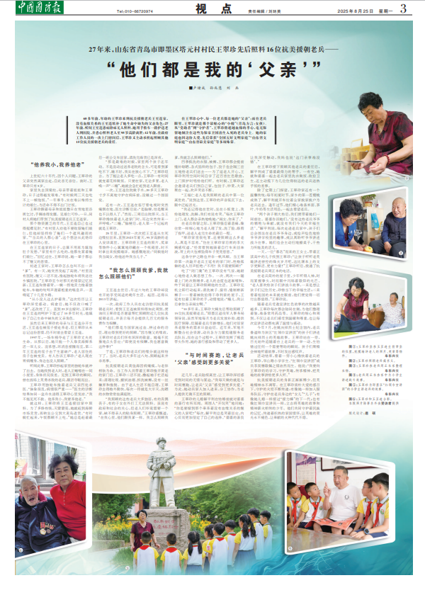 在老兵简朴的屋子里,少年听得入神,时而紧握拳头,时而眼中闪烁着敬仰的光芒。“老人喜欢给孩子们讲战斗故事,一来是想让孩子们记住历史,珍惜当下的幸福生活;二来看着祖国的未来就在眼前,他们便觉得一切付出都值得。”王翠珍说。