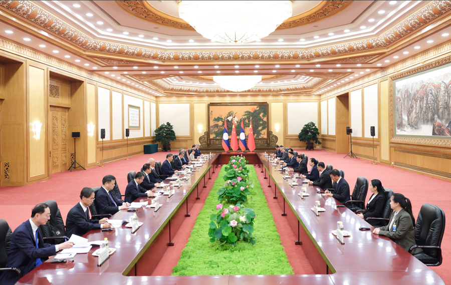 9月4日上午,中共中央总书记、国家主席习近平在北京人民大会堂会见来华出席2025年上海合作组织峰会和纪念中国人民抗日战争暨世界反法西斯战争胜利80周年活动并进行工作访问的老挝人民革命党中央总书记、国家主席通伦。新华社记者 黄敬文 摄