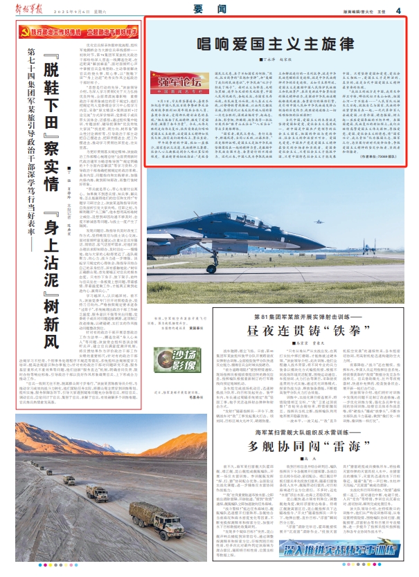 “我站立的地方是中国,我用生命捍卫守候,哪怕风似刀来山如铁,祖国山河一寸不能丢……”人民军队从诞生之日起,就把自己与国家、民族的命运紧紧联系在一起,一代代革命军人赤诚爱国、以身许国、精忠报国,树立起一座座爱国奉献的不朽丰碑。在强国建设、民族复兴的新征程上,我们应继续高擎爱国主义伟大旗帜,厚植爱党、爱国、爱社会主义的情感,将“国家兴亡、我之责任”化为报国之志、强军之行,忠实履行新时代使命任务,争做爱国主义精神的坚定弘扬者、实践者和传播者。