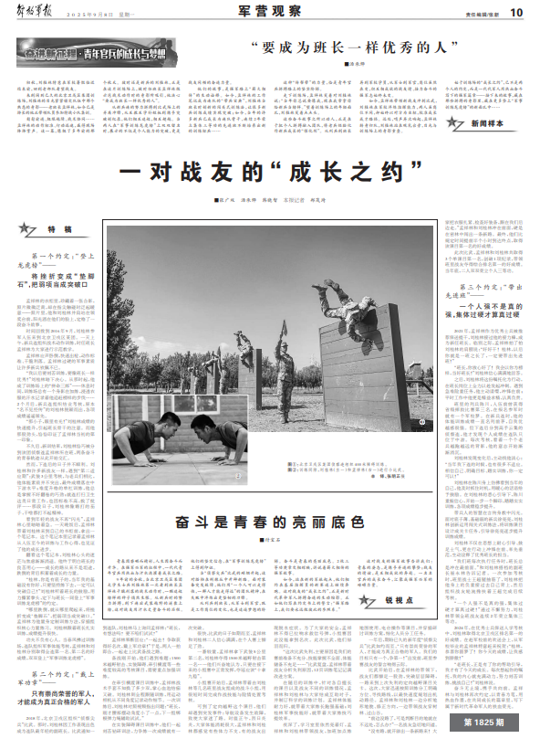 如今,站在新的军旅起点,他们相约在基层指挥员的新赛道上继续奔跑。这对战友的“成长之约”,正是新时代革命军人拼搏奋进的生动缩影。正如他们写在约定书上的誓言:“强军路上,我们要永远做彼此的参照系。”