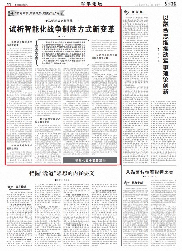 随着智能化技术快速发展及其在军事上的广泛应用,智能化战争正成为信息化战争后的新战争形态,而耗散战则成为智能化战争的典型方式。