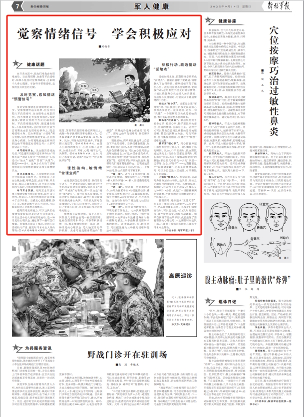 管理情绪,绝非追求“无悲无喜”,而是为了提升自身心理韧性,从而更专注、更高效地履职尽责。当战友们情绪波动时,可以记住这3点:及时觉察信号、理性接纳感受、积极行动疏解。如果自我调节后效果不好,或者出现了需要警惕的心理信号,一定要及时向连队干部、心理骨干或体系医院的心理医生寻求专业帮助。
