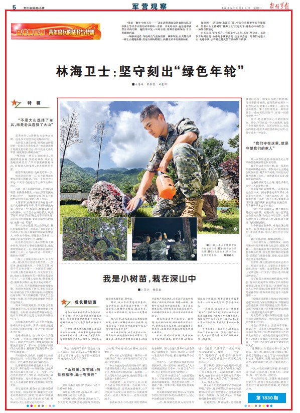 第一次参加巡逻,爬上山顶眺望,营区宛如绿海中的一座孤岛。带队的班长告诉李天智,艰苦寂寞的环境最能塑造人,中队有个传统,每逢重大任务前,大家都会对着空旷的山谷,喊喊山。