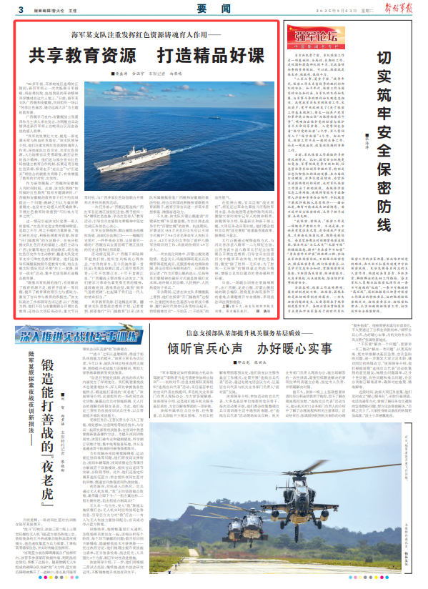 共享教育资源,打造精品好课。翻看该支队思想政治教育计划,记者看到,探索推行“开门搞教育”以来,该支队所属舰艇借鉴广西舰和安徽舰的做法经验,结合实际情况积极探索联教共育新路子,教育引导官兵进一步筑牢思想根基、增强奋进动力。