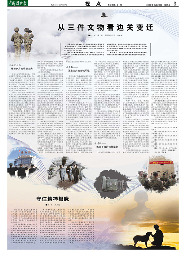 “缺氧不缺精神,艰苦不怕吃苦”“宁可牺牲生命,不丢国土一寸”……这一句句誓言,是一代代边防官兵的精神写照。他们“头顶边关月,情系天下安”,不断续写着扎根边疆的动人故事和守卫边防的不朽诗篇。一代代官兵默默奋斗,手摇发电机、旧马鞍、老哨楼等边防线上的文物,把他们的英雄壮举和精神根脉永远保存下来,化为催人奋进的精神路标,激励着后来者一路坚定向前。