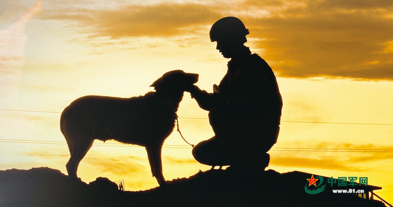 哨兵与军犬在夕阳下的剪影。