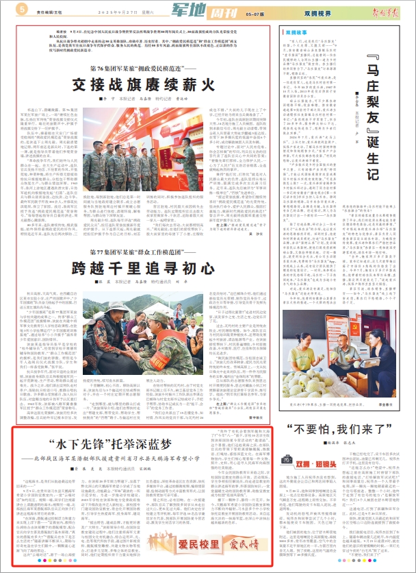 这次“云端对话”,源于一场山海接力。在该部20多年倾力帮建下,坐落于黔北深山的天鹅海军希望小学成了当地设施最优、功能最全、“军味”最浓的一所示范学校。为进一步推动学校建设,2023年学校在该部和地方党委政府推动下升级改造并迁入新校址。新校园专门建设国防宣教室,常态化开展国防教育,引导学生热爱海军、投身海军、建设海军。