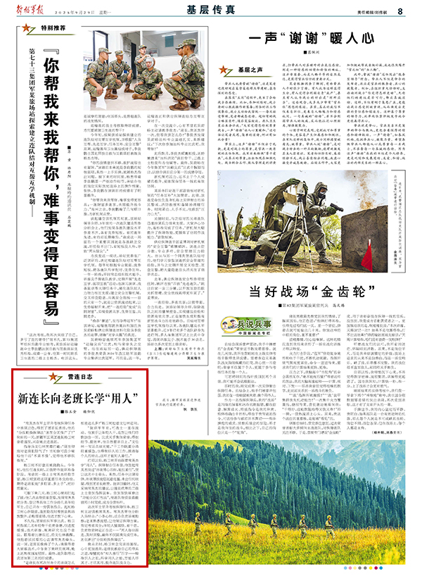 晚点名时,杨卫树念完表扬通报,心中更加透亮:老班长教给自己的带兵之道,精髓就在“知人善任”四字——精准识人之长,科学用人之能,方能人尽其才、才尽其用,提升连队战斗力。