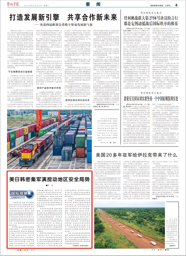 当前,美日韩刻意渲染鼓噪他国威胁,通过联合军演强化双边和三边关系,非但无法掩盖其构建排他性“小圈子”的真实图谋,反而会加剧地区安全格局的阵营化对抗风险,其动向值得地区国家高度警惕。