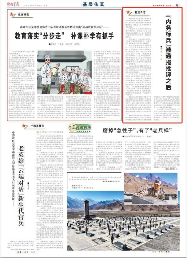 在此过程中,小张也受益良多。不仅在之后的内务评比中重新进入标兵行列,还主动查摆纠正了自己在平时工作训练中的一些不良习惯。“下一次,我要争取评上‘训练标兵’!”小张充满自信地说。