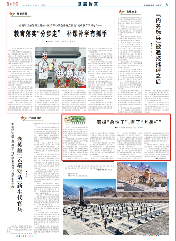 那天晚上,得知这一情况,排长找到我。他并未直接批评,而是心平气和地讲道理:“我能理解你想尽快完成任务的心情,但老兵要有老兵的样子,遇事要结合实际情况,先想好解决办法再作决定,不能盲目蛮干、钻‘牛角尖’。”