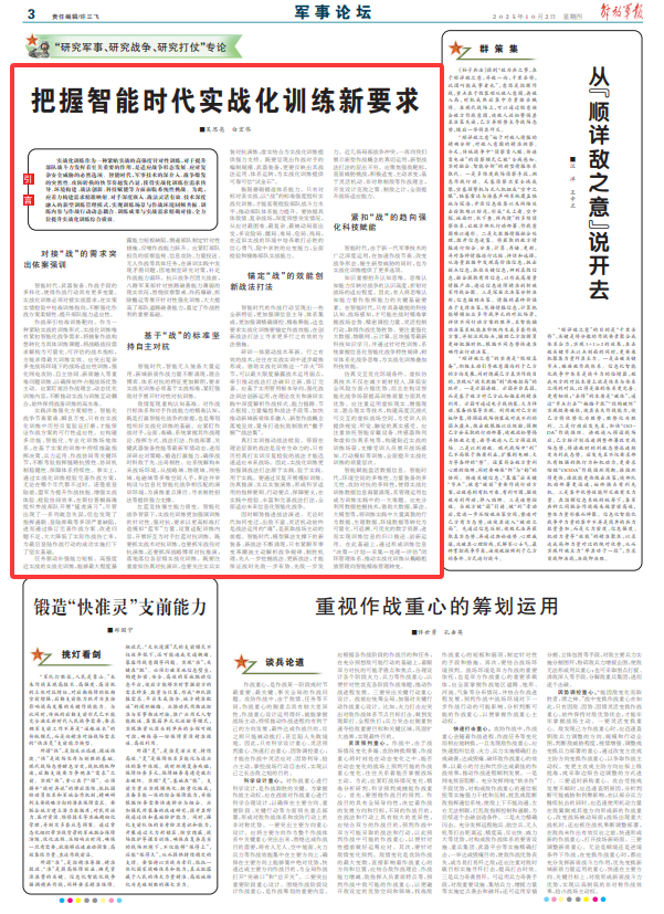 智能时代的作战行动呈现出一些全新特征,更加强调信息主导、体系集成,更加强调精确调控、精准释能,这也要求实战化训练要锚定作战效能,在创新战法打法上寻求更多行之有效的方法措施。